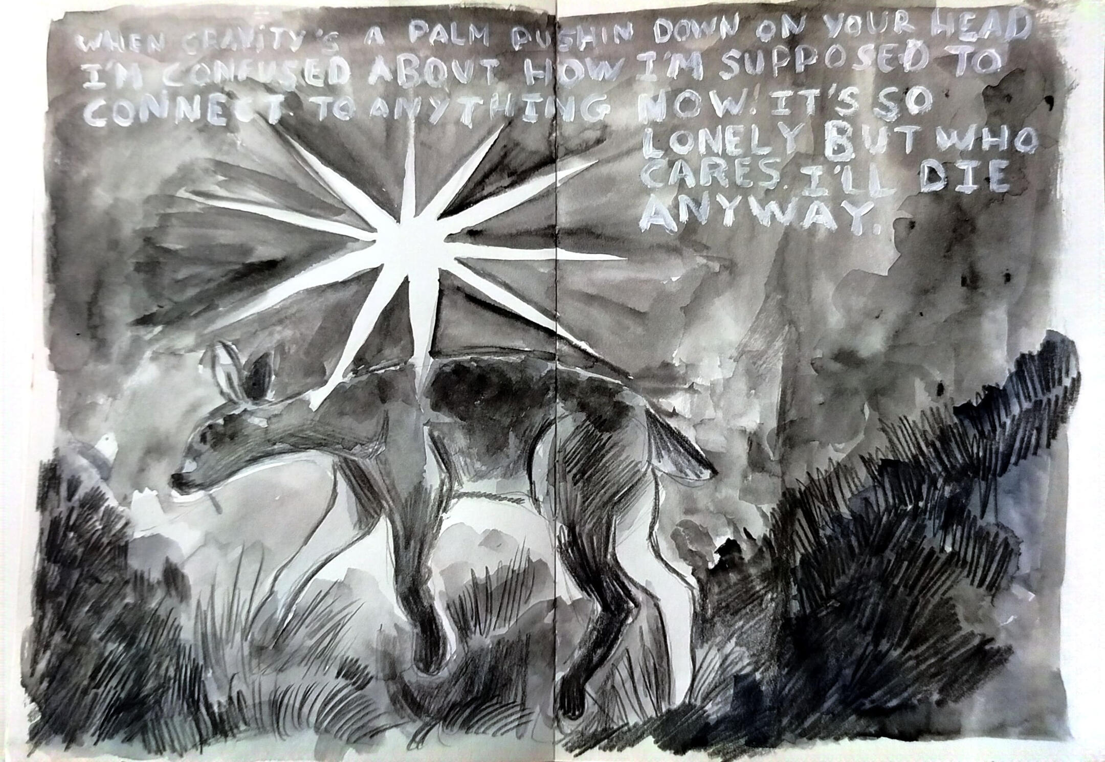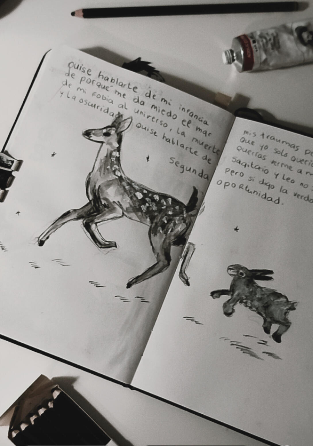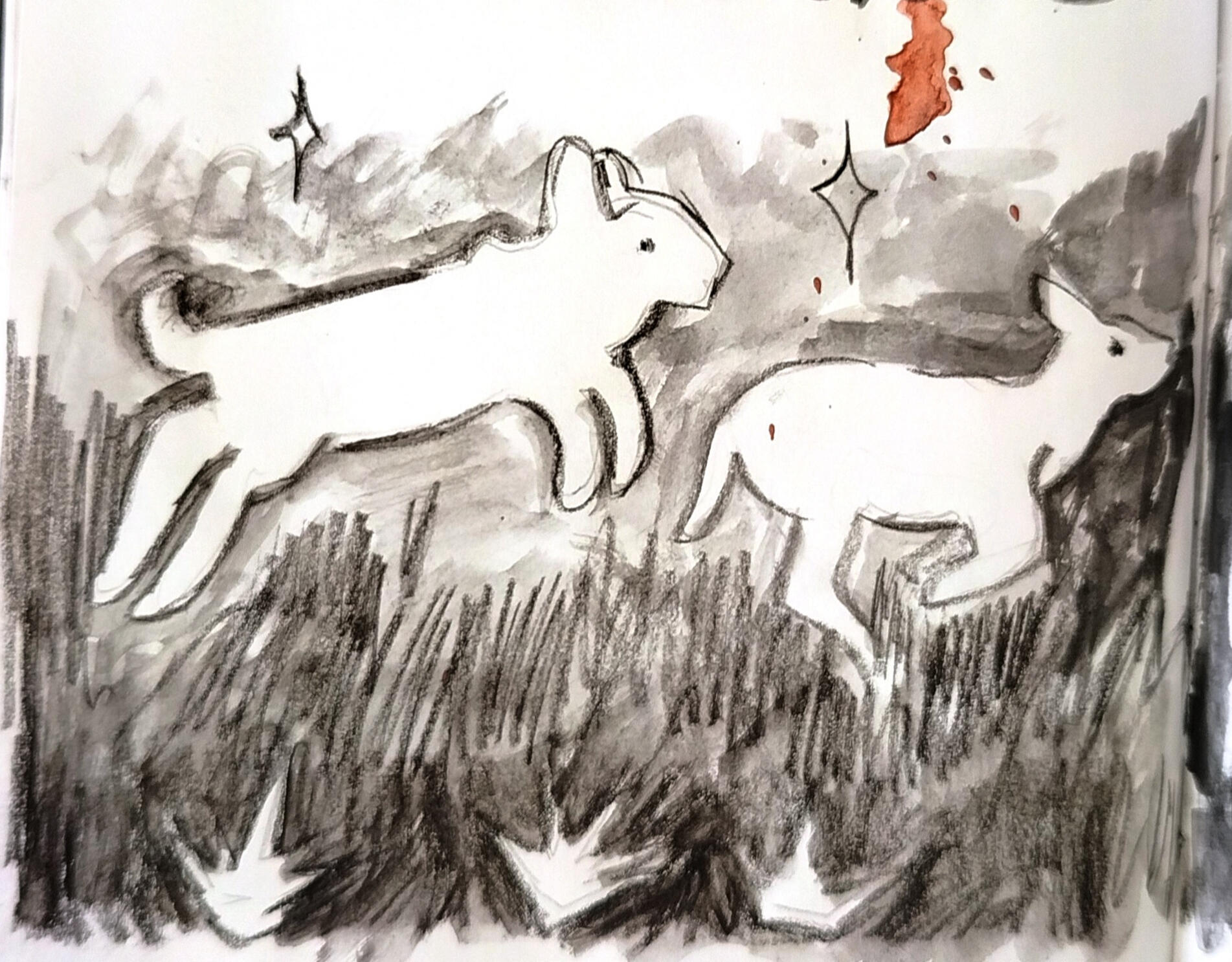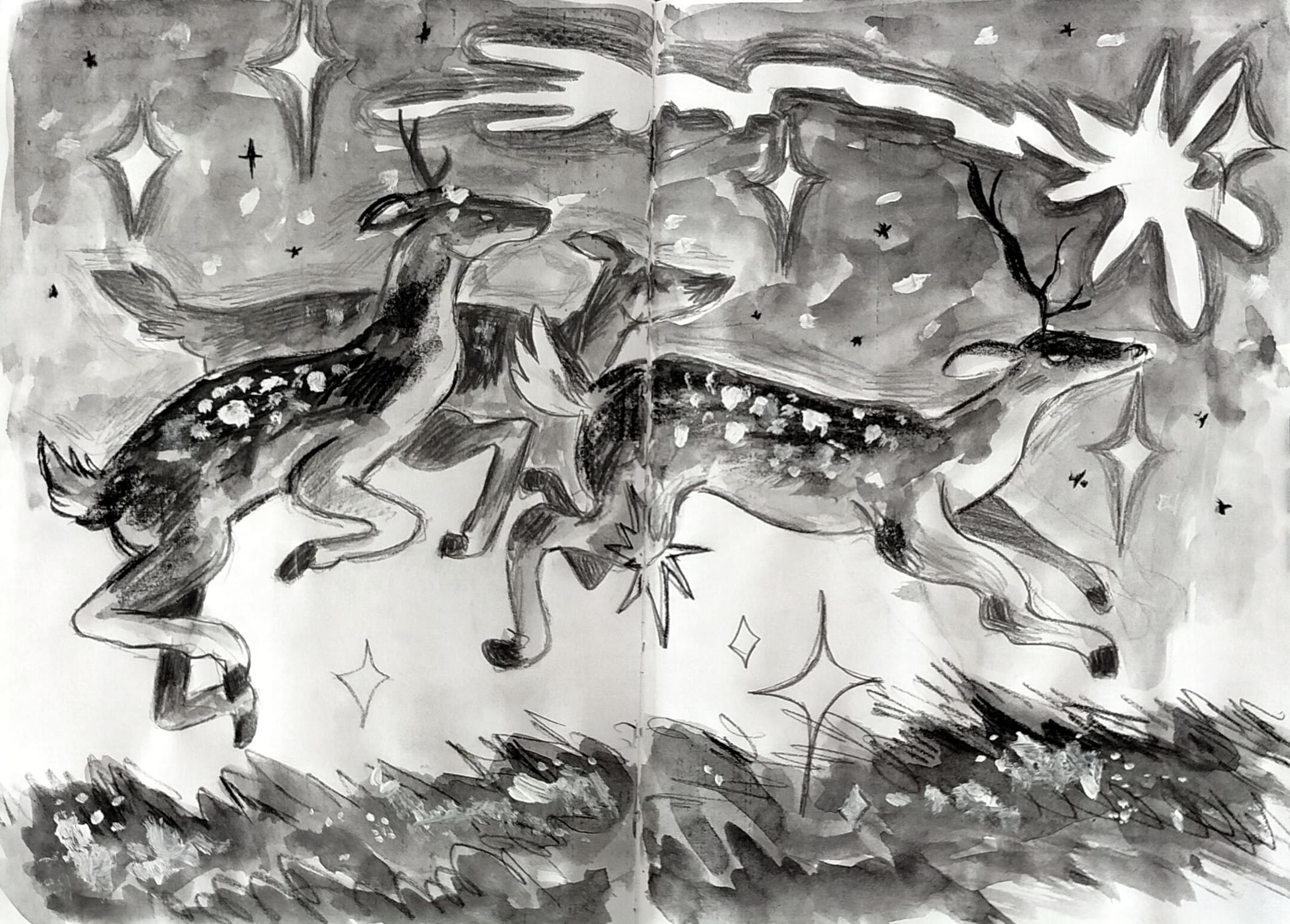 my sketchbook is all about charcoal, black watercolor, wasted pencils and white acrylics. this is how i found a way of expressing myself best, through little animals and quick traces and paint stains.and then, there come my ocs, a group of young ones exploring a world they barely know, waiting for something bigger to happen. i have drawn them for years, and my style has evolved anytime i dedicate a couple of hours to think how is their life going (probably not very good so far.)